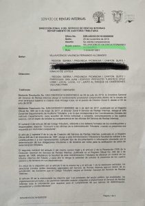 Mauro Tejada, delegado de la Dirección Zonal 9 del SRI, solicita a Villavicencio que comparezca e indica que deberá llevar consigo “toda la documentación que respalde la relación comercial entre RECORSA S.A y SYNOHYDRO CORPORATION a partir del ejercicio fiscal 2010, como son contratos, copias de cheques, etc.”. El funcionario se ampara en el artículo 96, numeral 4, del Código Tributario, que determina las obligaciones de los contribuyentes, refiriéndose específicamente a “concurrir a las oficinas de la Administración Tributaria, cuando su presencia sea requerida por la Autoridad competente”.