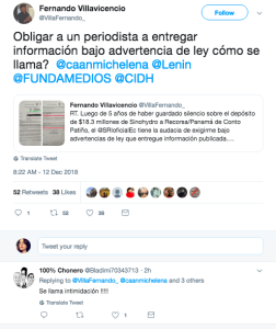 A través de una notificación, el Servicio de Rentas Internas (SRI) indicó a Fernando Villavicencio que este 13 de diciembre debe comparecer en las oficinas de la institución, en Quito con el fin de entregar información relacionada a su investigación en torno a RECORSA S.A. y SYNOHYDRO CORPORATION, ambas contratistas del Estado. El 12 de diciembre, el periodista publicó en su cuenta de Twitter el oficio que habría recibido el pasado 28 de noviembre. Denunció el hecho, junto a la frase “¿obligar a un periodista a entregar información bajo advertencia de ley cómo se llama?”.