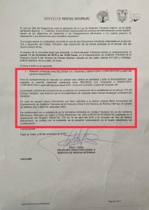 En el documento se añade que el incumplimiento de la solicitud se “efectúa en prevención a lo establecido en el Art. 315 del Código Tributario, que dispone que el incumplimiento de cualquier deber formal constituye contravención tributaria”.