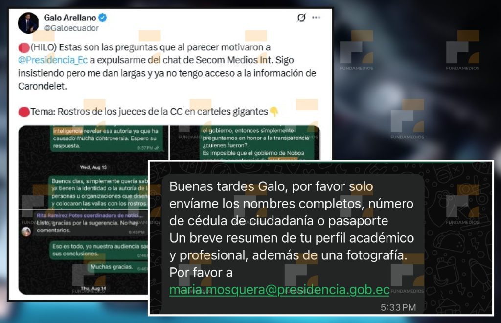 El corresponsal internacional Galo Arellano denunció que fue retirado del chat oficial de medios de Presidencia en agosto de 2025 y que, desde entonces, no ha recibido respuesta a sus solicitudes de reincorporación. La medida se habría dado tras preguntas sobre carteles con los rostros de jueces de la Corte Constitucional y los cambios constitucionales en El Salvador.