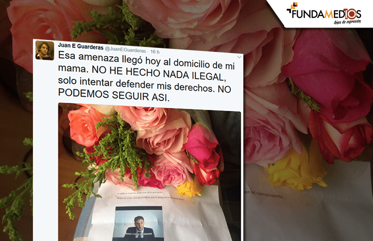 La tarde del 28 de marzo de 2017, el periodista Juan Esteban Guarderas, quien lidera una iniciativa para demandar al presidente Correa por bloquear a ciudadanos en Twitter, fue amenazado de muerte a través de un mensaje que llegó a la casa de su madre, junto a un ramo de flores. Esto ocurrió cinco días después de que planteara públicamente la iniciativa.