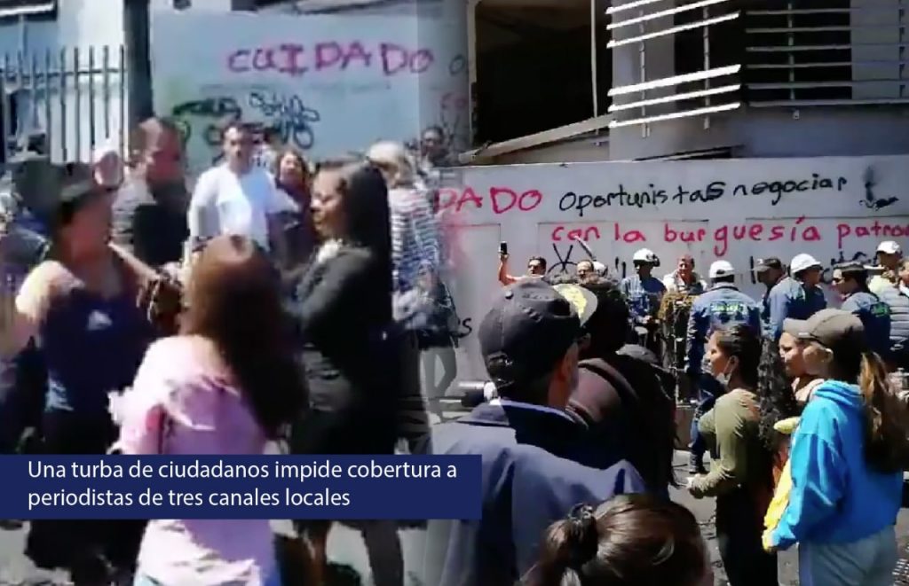 María Isabel Carmigniani, reportera y presentadora de noticias de la comunidad de Ecuavisa, fue increpada verbalmente por manifestantes. Comentó a FUNDAMEDIOS que le acusaban de no contar la verdad y de no ser imparcial con la información. “Tuvimos que sacar el cobertor del micrófono porque así últimamente hemos tenido que hacer las entrevistas para que no nos identifiquen”, aseguró.