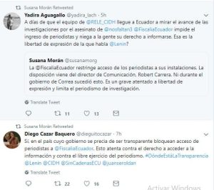 Otros profesionales, como Diego Cazar Baquero, Marieta Campaña y Yadira Aguagallo también se pronunciaron al respecto en sus redes sociales. Los periodistas enfatizan en que, a pocos días de la visita de la Relatoría para la Libertad de Expresión de la Comisión Interamericana de Derechos Humanos (CIDH), prevista para el 22 de noviembre, instituciones públicas adoptan posiciones que atentan contra el derecho a la libertad de expresión.
