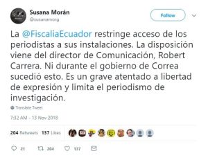 Este martes 13 de noviembre, varios periodistas denunciaron a través de Twitter la restricción de acceso a información e ingreso a las instalaciones de la Fiscalía General del Estado, en Quito. La orden, según la periodista Susana Morán, viene directamente del director de Comunicación de la institución, Robert Carrera, según comunicaron los guardias de la garita.