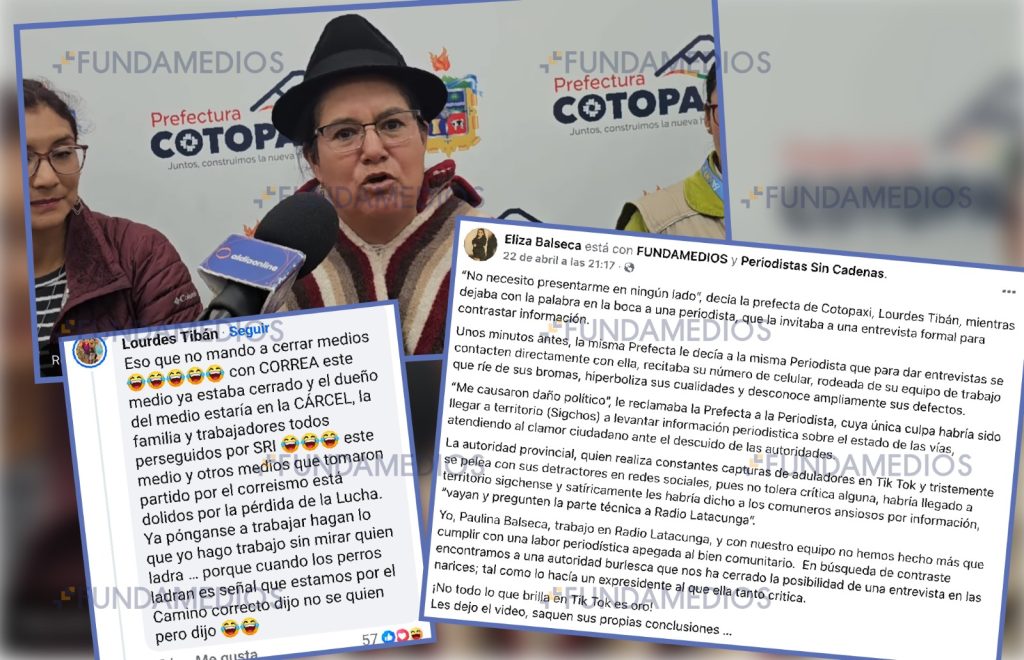 Ecuador, 24 de abril de 2025.- La prefecta de Cotopaxi, Lourdes Tibán, no quiso dar una entrevista a Radio de Latacunga. Tibán se justificó en que dicho medio le habría “causado daño político” tras una nota emitida y publicada por el medio el 31 de marzo sobre obras viales incompletas en el cantón Sigchos. Después de la transmisión, Tiban, por varias ocasiones, se ha referido a la radio de manera irónica y haciendo burlas.