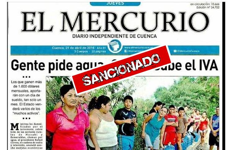 The newspaper El Mercurio, from Cuenca, was sanctioned on May 13th, 2016, with a written warning by the Intendancy of Communication and Information Zone 6 for considering that the newspaper was responsible of publishing a headline that did not correspond to reality.