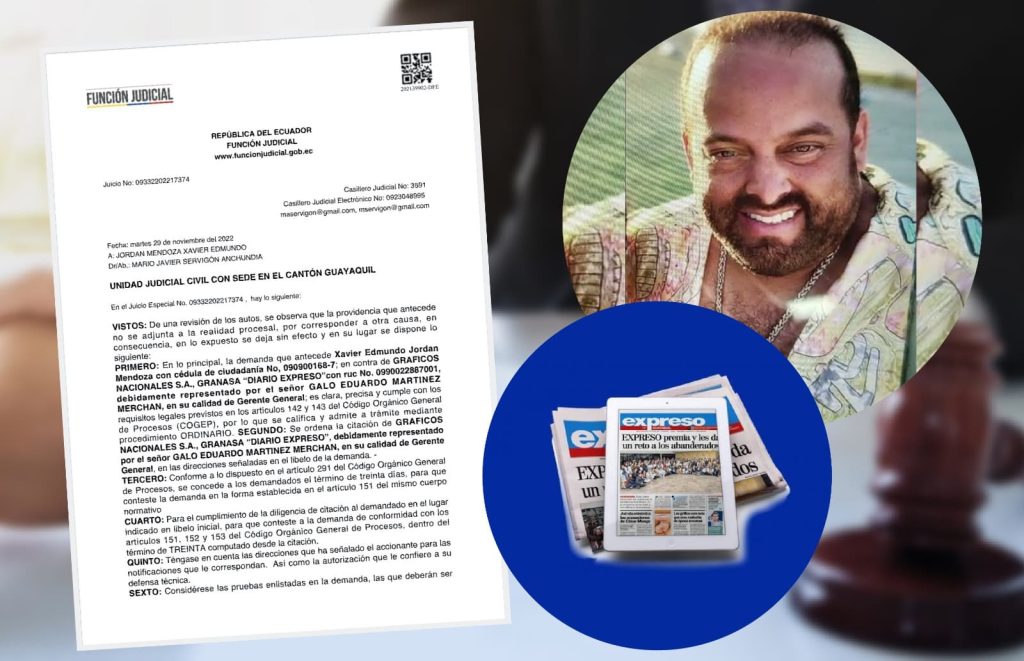 Ecuador, 22 de marzo de 2023.- El procesado por corrupción, Xavier Jordán, inició una demanda contra el periodismo en Ecuador. Esta vez interpuso un proceso judicial contra el diario Expreso por “daño moral”. Ingresó la demanda el 09 de noviembre de 2022 en la Unidad Judicial Civil con sede en Guayaquil. El 29 de noviembre, el Consejo de la Judicatura concedió la demanda y señaló que cumple con los requisitos legales.