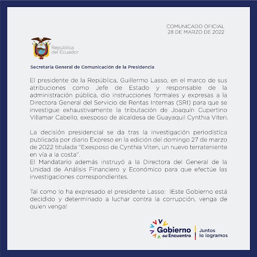 El presidente, Guillermo Lasso, dio instrucciones formales al Servicios de Rentas Internas para que abra una investigación sobre la tributación de Joaquín Villamar y a la Directora de la Unidad de Análisis Financiero para que realice las investigaciones correspondientes. El Presidente aclaró que esta decisión se da tras la investigación de diario Expreso.