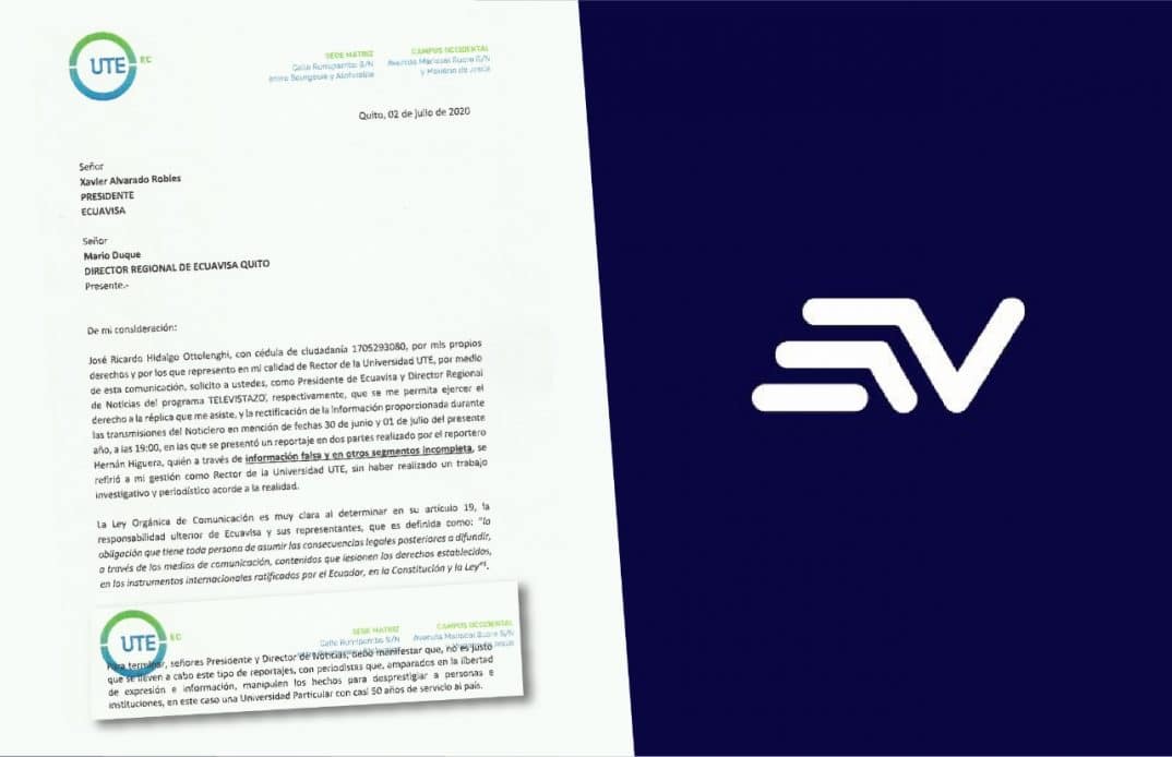 Ecuador, 3 de agosto de 2020.- El rector de la Universidad UTE, Ricardo Hidalgo Ottolenghi, no quedó conforme con la rectificación que hizo el canal Ecuavisa a un reportaje sobre la situación económica y financiera del centro de educación superior, y publicó un comunicado amenazante. En un pedido inicial de rectificación, el rector de la Universidad cuestionó la ética del periodista y su uso de fuentes, lo cual contraviene el derecho de opinión contemplado en leyes nacionales y en tratados internacionales.