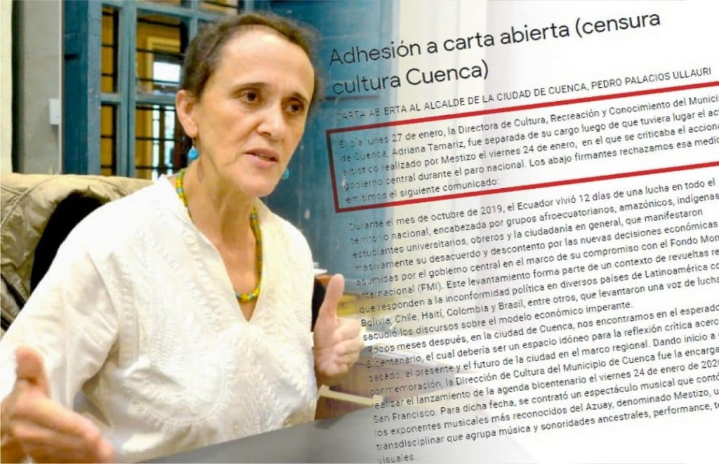 A través de una carta pública se denunció que el alcalde de Cuenca (sierra sur de Ecuador), Pedro Palacios Ullauri, exigió la renuncia a la directora de Cultura y Recreación del Municipio, Adriana Tamariz. El hecho se produjo el pasado 27 de enero, tras la presentación de un performance artístico de la agrupación Mestizo, el viernes 24. En el acto, que se llevó a cabo en la Plaza de San Francisco de la capital azuaya, se criticó la acción del Gobierno contra la población indígena, durante el paro nacional de octubre de 2019.