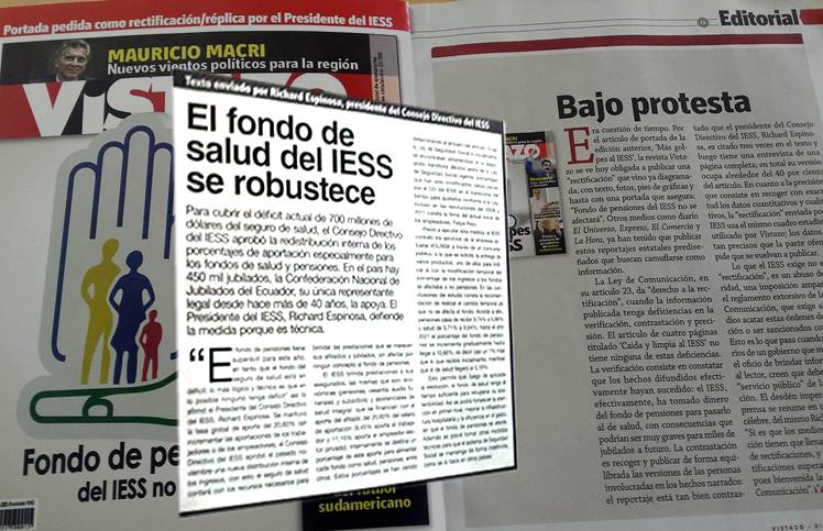 El 17 de diciembre, Revista Vistazo publicó bajo protesta un pedido de rectificación del presidente del consejo directivo del IESS, Richard Espinosa. El medio de comunicación dedicó su portada interior y cuatro páginas para acatar la exigencia del funcionario. Sin embargo, no dedicó su portada, como lo había pedido Espinosa quien envió los textos previamente diagramados y titulados. La revista también dedicó otras tres páginas completas de su edición No 1160 para publicar una réplica de la Secretaría Nacional de Educación Superior (Senescyt)