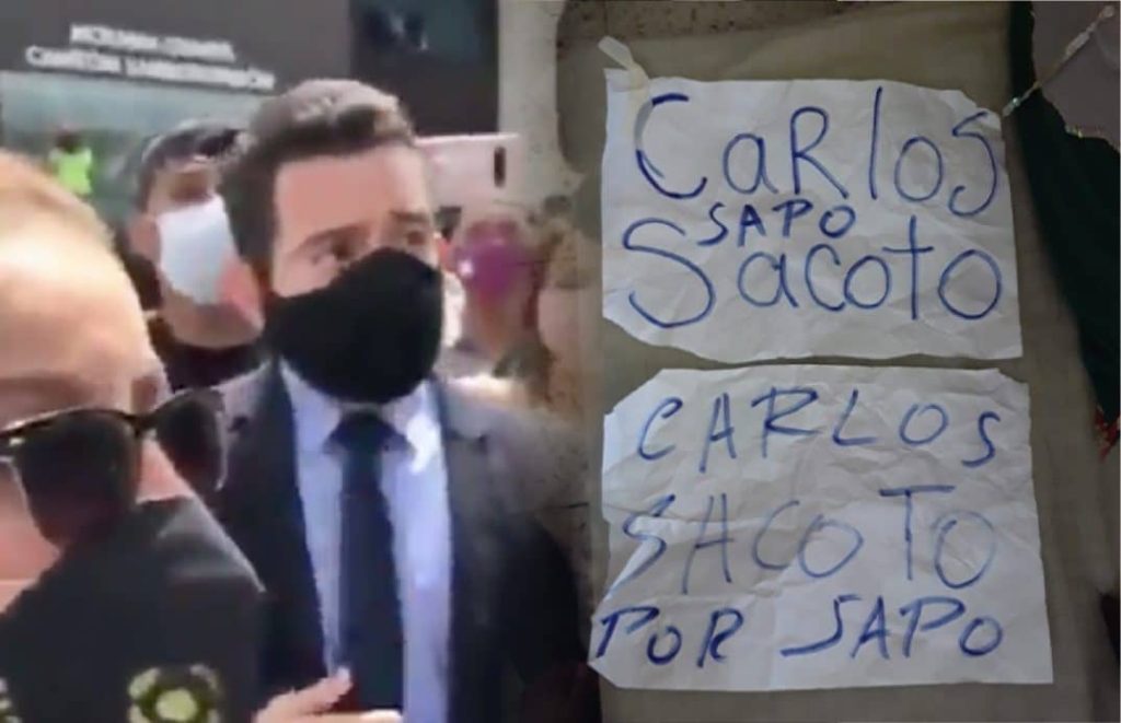 Actualmente, Sacoto cuenta con protección policial que lo lleva desde su casa hasta el canal de televisión y viceversa, tras una amenaza recibida el pasado 9 de mayo, cuando dos carteles con advertencias fueron pegados en una fachada a 50 metros de su casa. “Carlos sapo Sacoto” y “Carlos Sacoto por sapo”, decían los panfletos.