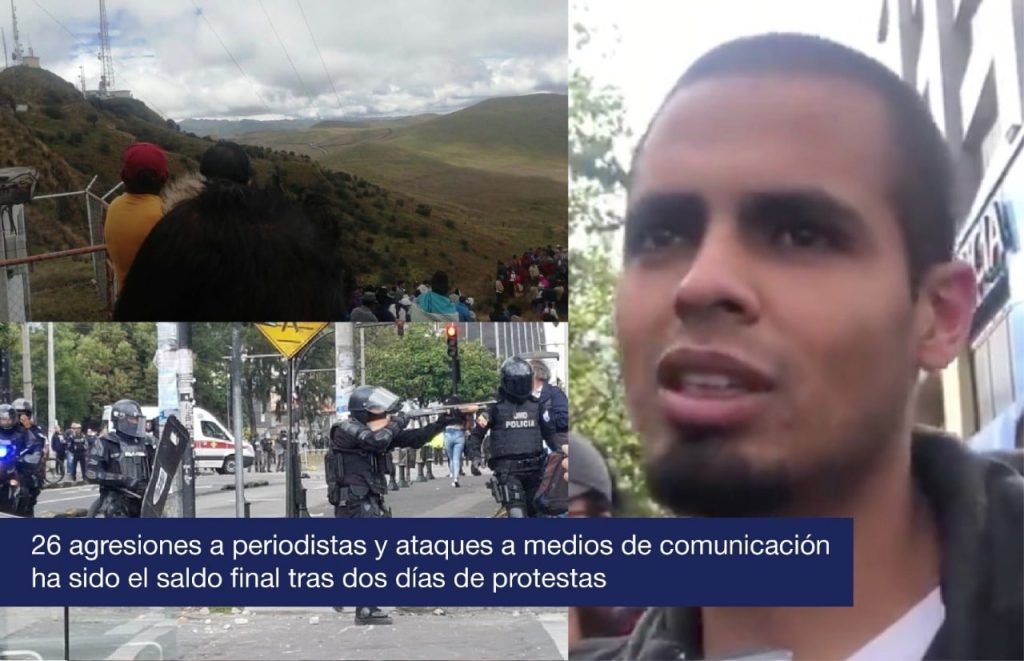 Desde el inicio de las protestas, FUNDAMEDIOS reportó 22 casos en los que uniformados arremetieron de forma violenta contra periodistas, fotógrafos y camarógrafos de medios digitales, impresos y televisivos. Adicionalmente, documentó un caso más de agresión verbal a una periodista por manifestantes, un atropellamiento a un camarógrafo por un taxista, una agresión a un corresponsal en Guayaquil por vándalos y una detención arbitraria al periodista de Udla Channel. Además, contabilizó ataques a medios nacionales. Por ejemplo, un corte de electricidad a Radio Pichincha Universal (Quito), a radio Centro (Ambato) y a otros medios locales.