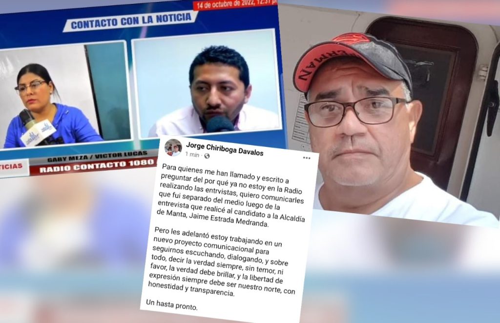 Ecuador, 19 de diciembre de 2022. Tres comunicadores manabitas han sido despedidos intempestivamente de dos radios, luego de tener contacto con candidatos a la Alcaldía de la Ciudad de Manta, en Manabí. Se trata de los radiodifusores Jorge Chiriboga, de Radio Modelo, y Víctor Lucas y Gabriela Alarcón de Radio Contacto.