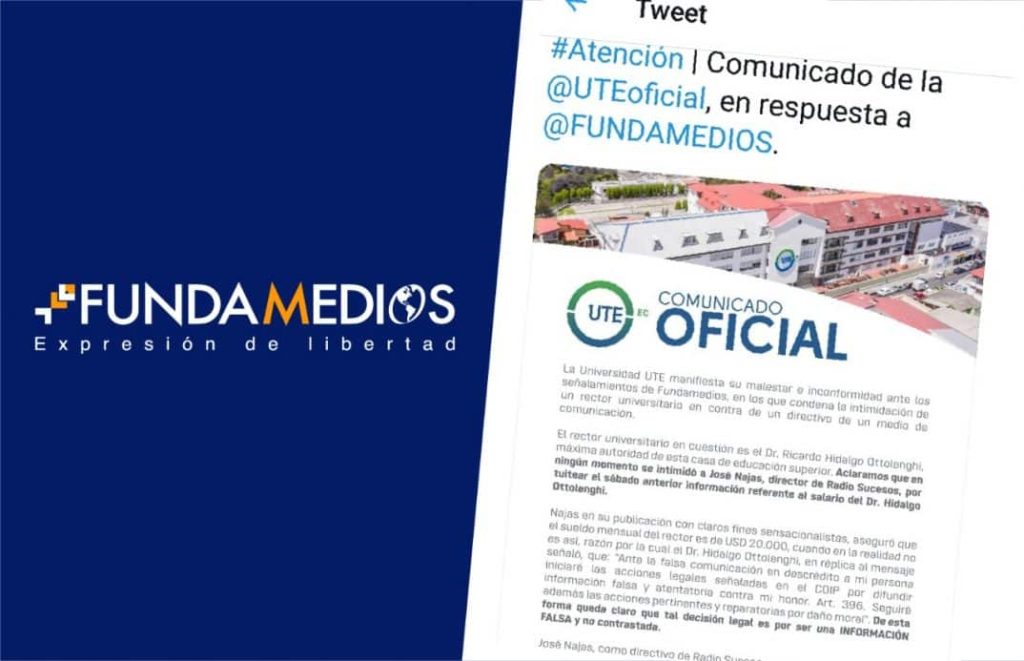 Ecuador, 14 de mayo, 2020.- Este jueves 14 de mayo, la organización emitió la alerta “Fundamedios condena la intimidación de un rector universitario en contra de un directivo de un medio de comunicación”. Ante esto, la Universidad UTE emitió un comunicado de rechazo.