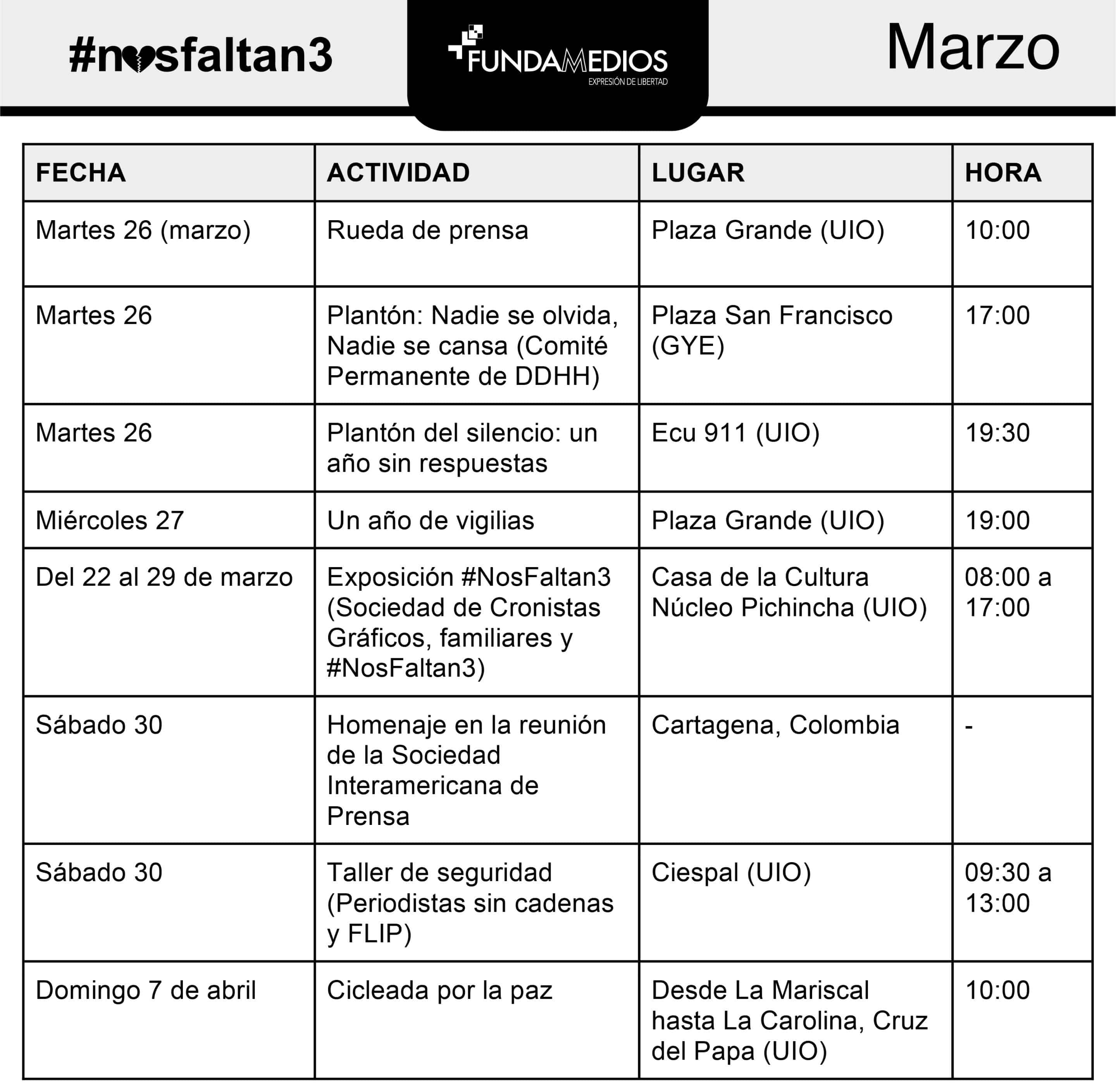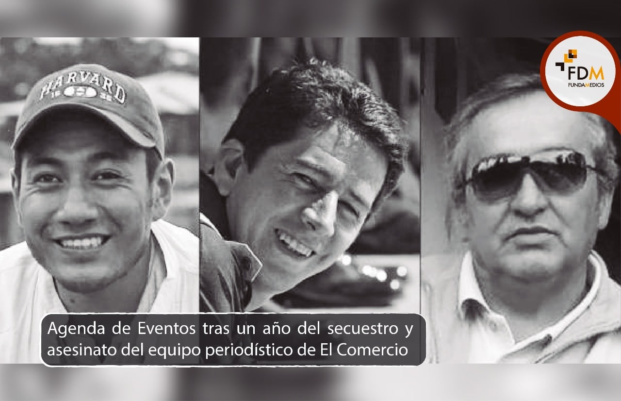 El pasado 26 de marzo el equipo periodístico de El Comercio viajó a la frontera norte de Ecuador para investigar distintas situaciones de violencia que se reportaron en Mataje. Paúl Rivas, Javier Ortega y Efraín Segarra fueron secuestrados y asesinados en la frontera colombo-ecuatoriana. El Colectivo Nos Faltan 3, en honor al primer aniversario del secuestro y asesinato de sus colegas, desarrollará una serie de eventos que buscan rendir homenaje a los periodistas y abrir espacios de diálogo y análisis en torno a la seguridad del gremio.