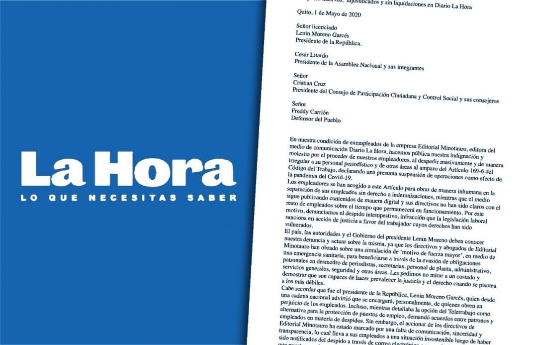 El 1 de mayo, 35 excolaboradores de la empresa Editorial Minotauro, editora del medio diario La Hora, suscribieron una carta denunciando despidos masivos, injustificados y sin liquidaciones. La misiva fue dirigida al presidente de Ecuador, Lenín Moreno; al presidente de la Asamblea Nacional, César Litardo; a Cristian Cruz, presidente del Consejo de Participación Ciudadana y Control Social, y al Defensor del Pueblo, Freddy Carrión.