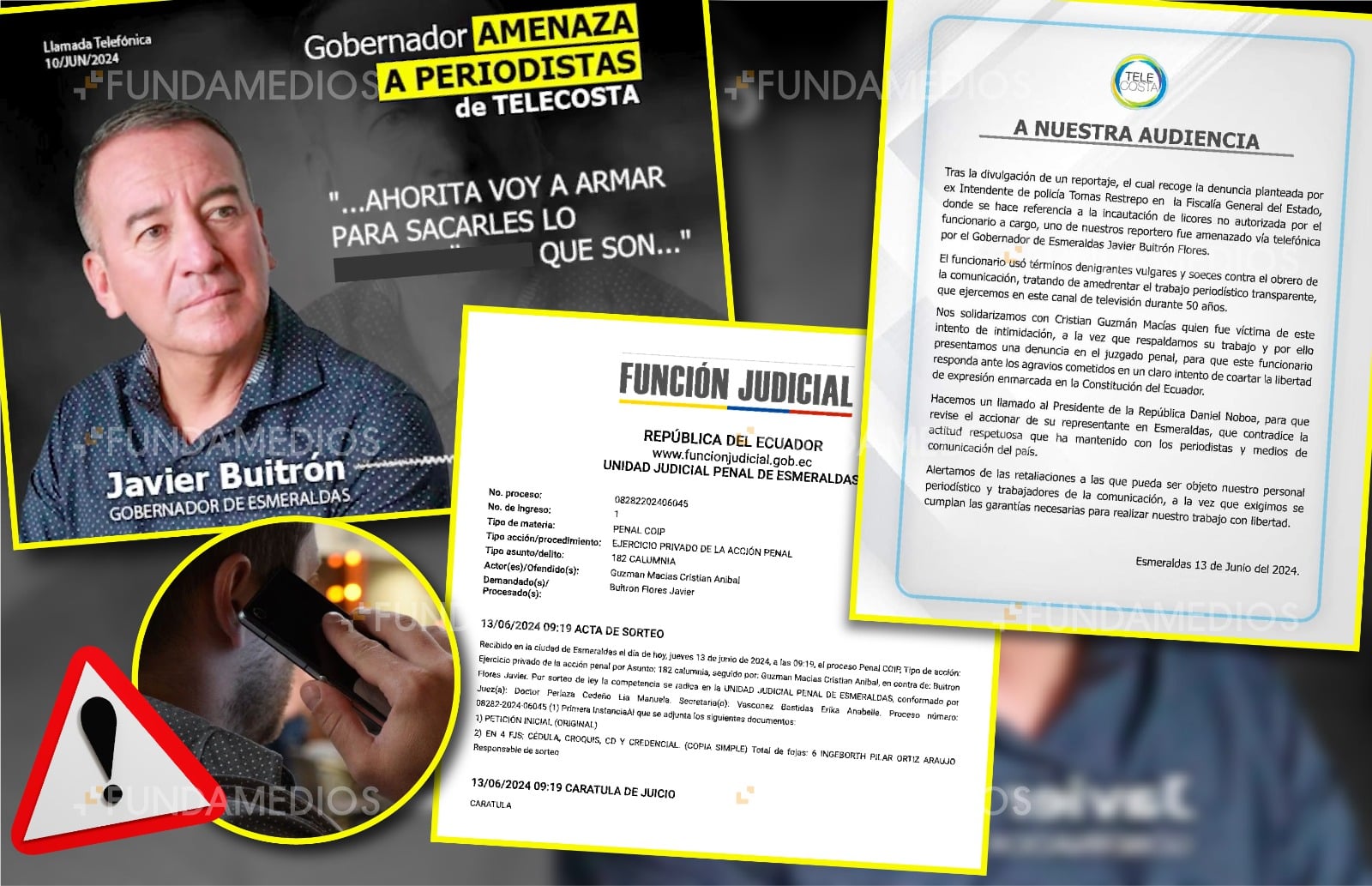 Ecuador, 13 de junio de 2024· El gobernador de Esmeraldas, Javier Buitrón, insultó al periodista Cristian Guzmán, del medio Telecosta, durante una llamada telefónica, el lunes 10 de junio. Esto, tras un reportaje publicado por el periodista en el que el exintendente de esa provincia Tomás Restrepo denunciaba que dos funcionarios de la Gobernación tomaron su nombre para realizar operativos e incautar mercadería.