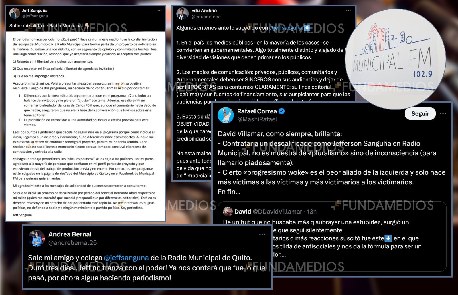 Ecuador, 07 de octubre de 2024· Tras solo tres días en la Radio Municipal de Quito, el periodista Jefferson Sanguña renunció de este medio de carácter público luego de que le prohibieron entrevistar a un político y le reclamaron un “desbalance de invitados” según lo explicó en un comunicado publicado en su cuenta de la red social X.