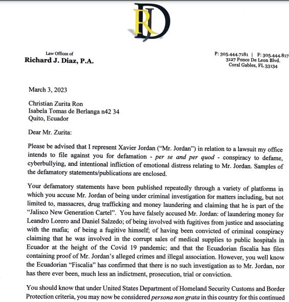 “Ha acusado falsamente al señor Jordán de: lavado de dinero para Leandro Norero y Daniel Salcedo; estar involucrado con prófugos de la justicia y asociarse con la mafia para; de ser él mismo un fugitivo; de haber sido condenado por concierto para delinquir (…) Sin embargo, bien se sabe que la Fiscalía ecuatoriana ha confirmado que no existe tal investigación sobre el señor Jordán, ni la ha habido alguna vez, y mucho menos una acusación, juicio o condena”. (traducido), se lee en el texto.