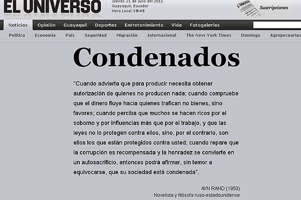 - El 20 de septiembre de 2011, la Segunda Sala Penal de la Corte Provincial de Justicia del Guayas ratificó la sentencia dictada en primera instancia contra Diario El Universo, sus principales directivos y el ex jefe de opinión del Diario, condenandolos a tres años de cárcel y al pago de $40 millones de dólares.El pasado 20 de septiembre, la Segunda Sala Penal de la Corte Provincial de Justicia del Guayas ratificó la sentencia dictada en primera instancia contra Diario El Universo, sus principales directivos y el ex jefe de opinión del Diario.