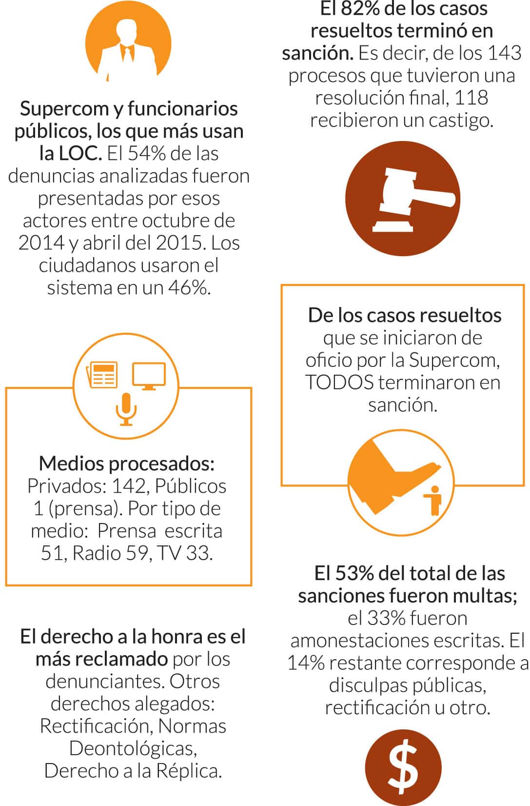 El estudio también concluye que la multa fue la sanción más usada: fue impuesta en el 53% de los casos. De las sanciones, solo una correspondió a un medio público, mientras que las otras 142 fueron impuestas a medios privados. Las otras sanciones más usadas son las amonestaciones escritas (33%), las disculpas públicas (9%) y la rectificación (5%).