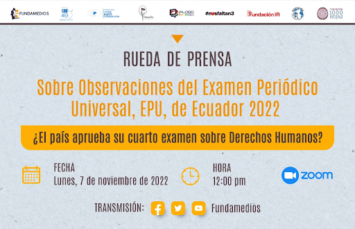 Luego de la sesión durante Ecuador será examinado, la Coalición de organizaciones de la sociedad civil conformada para dar seguimiento al EPU de Ecuador, dará una rueda de prensa virtual, dónde planteará las reacciones desde la sociedad a las observaciones que reciba el Estado ecuatoriana. La rueda de prensa pueda seguirla por las redes sociales de Fundamedios: Facebook, Twitter, Youtube, o unirse vía Zoom en este enlace: https://bit.ly/3WtUbfy