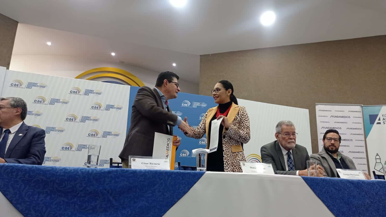 La presidenta del CNE, Diana Atamaint, dijo que la institución está preparada para que el proceso electoral sea limpio. «Se desarrollaron talleres sobre coberturas electorales, el avance de comicios y se recogieron aportes de periodistas sobre seguridad», comentó. Puntualizó que Fundamedios debe tener la certeza de que se van a tomar en cuenta las recomendaciones y aportes recogidos porque con eso gana la ciudadanía. También expresó su reconocimiento a la organización y a la KAS en su lucha por fortalecer la democracia. Ratificó su compromiso en sumarse a procesos de capacitación y dijo que el acceso a la información de calidad fortalece la participación electoral de la ciudadanía.