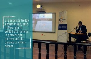 Este 12 de noviembre, el periodista Freddy Aponte se presentó ante la Mesa por la Verdad y la Justicia: Perseguidos Políticos, Nunca Más, impulsada por el Consejo de la Judicatura Transitorio. En la audiencia, que se desarrolló en la Facultad de Derecho de la Universidad Central (Quito), el lojano relató detalladamente la persecución política de la que ha sido víctima desde hace más de una década por parte del exalcalde de Loja, José Bolívar Castillo.