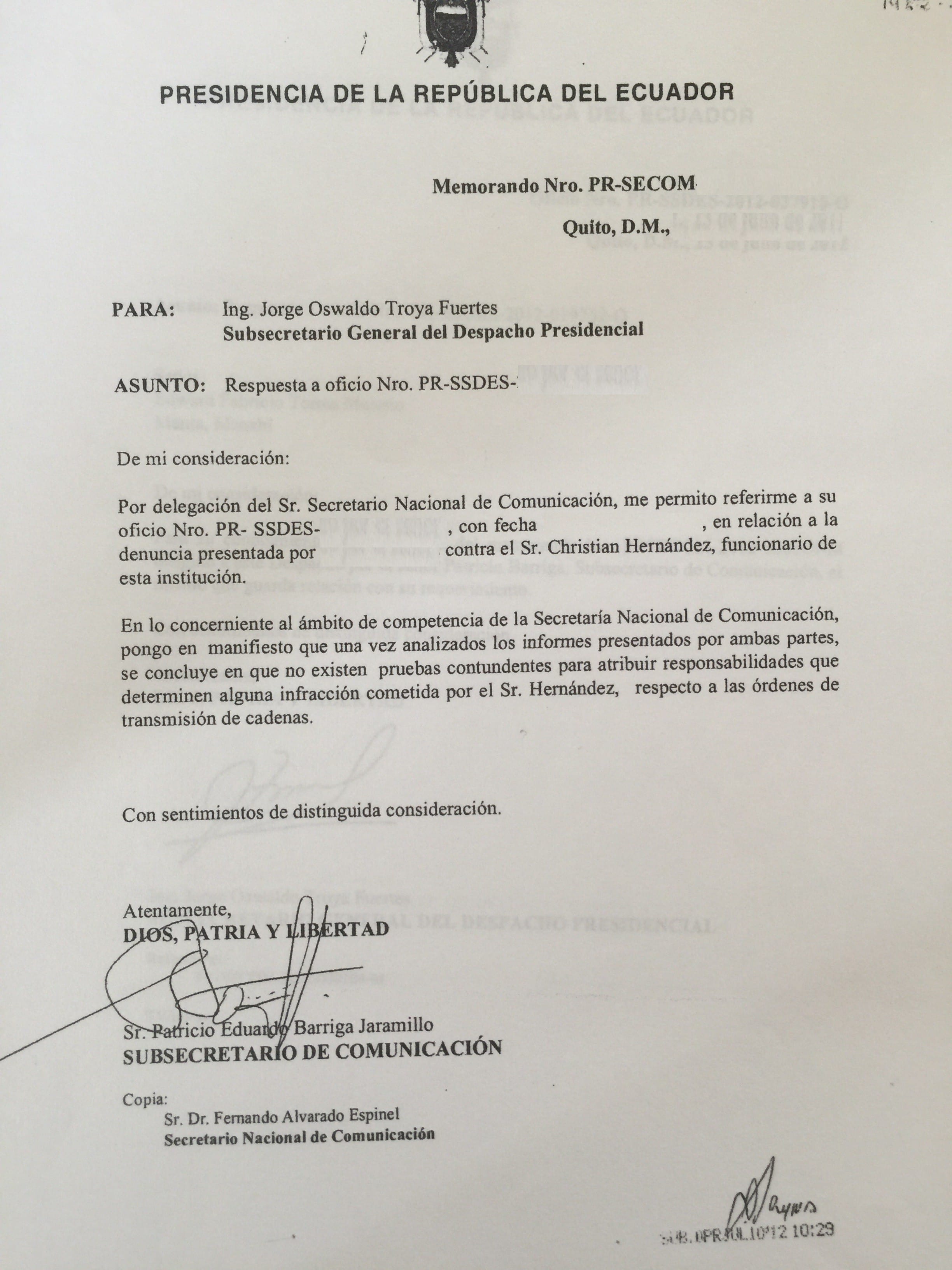 Finalmente y tras un memorando emitido por el Subsecretario General del Despacho Presidencial, se da a conocer que después de las investigaciones pertinentes la denuncia presentada y anteriormente detallada, concluye que no existen pruebas contundentes que determinen dicha infracción cometida por Christian Hernández. Es por esto que, al no existir una respuesta positiva que condene las ilegalidades de Hernández, el mismo ex funcionario solicita una audiencia con el Señor Presidente de la República, con el fin de tratar temas relacionados con la denuncia previa.