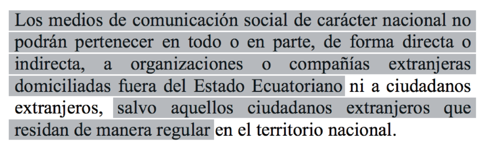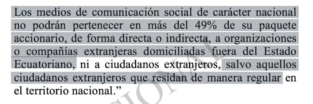 Tras las modificaciones, el artículo 6 explica que «los medios de comunicación social de carácter nacional no podrán pertenecer en más del 49 % de su paquete accionario, de forma directa o indirecta, a organizaciones o compañías extranjeras domiciliadas fuera del Estado Ecuatoriano, ni a ciudadanos extranjeros, salvo aquellos ciudadanos extranjeros que residan de manera regular en el territorio nacional”. Ximena Peña, legisladora del movimiento oficialista Alianza País (AP), impulsó ese texto.