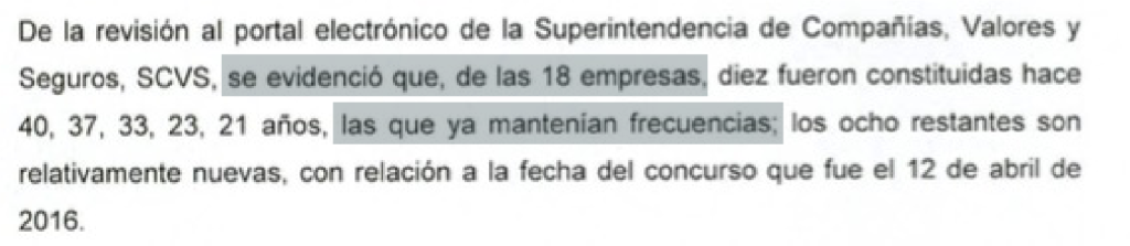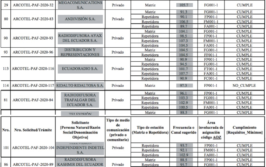 Así lo detectó un informe de la Contraloría General del Estado (CGE), realizado entre el 1 de enero de 2016 y el 31 de agosto de 2017. El documento desnudó irregularidades en el proceso y señaló que se abrió la puerta a la concentración de frecuencias en manos de tres grupos empresariales. Aunque en el reporte no se identificó a los accionistas de los conglomerados por su nombre, salieron a relucir las marcas Canela, Andivisión S.A y Capital Televisión de Manabí. Dichas empresas, acorde a investigaciones previas realizadas por Fundamedios (FDM), están encabezadas por Jorge Yunda, actual alcalde de Quito (Grupo A); el Fantasma González (Grupo B); y Lenín Andrade, empresario manabita (Grupo C).