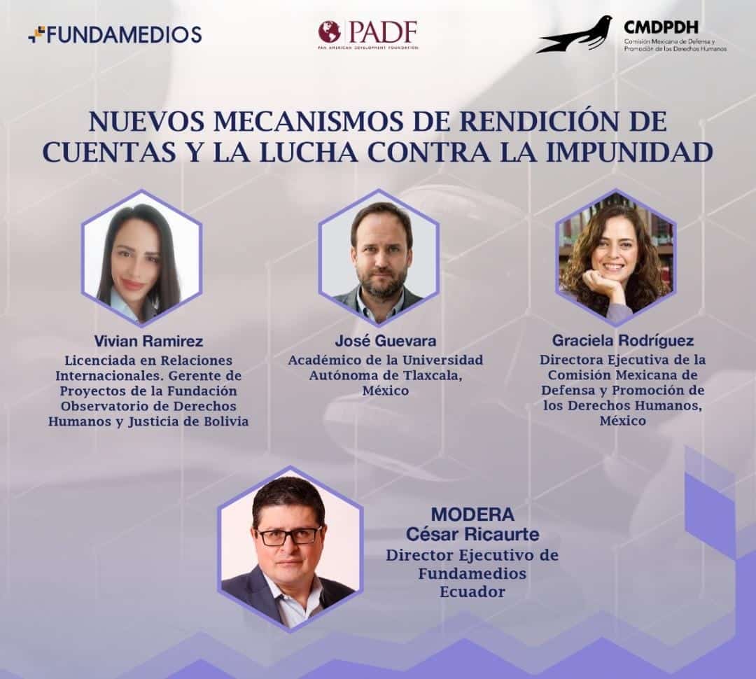 Ecuador, 08 de abril de 2021. Fundamedios realizó el foro denominado “Nuevos mecanismos de rendición de cuentas y la lucha contra la impunidad”, en el que participaron Vivían Ramírez, Gerente de Proyectos de la Fundación Observatorio de Derechos Humanos y Justicia de Bolivia; José Guevara, académico de la Universidad Autónoma de Tlaxcala; y Graciela Rodríguez, directora ejecutiva de la CMDPDH. César Ricaurte, director ejecutivo de Fundamedios, moderó la conversación.