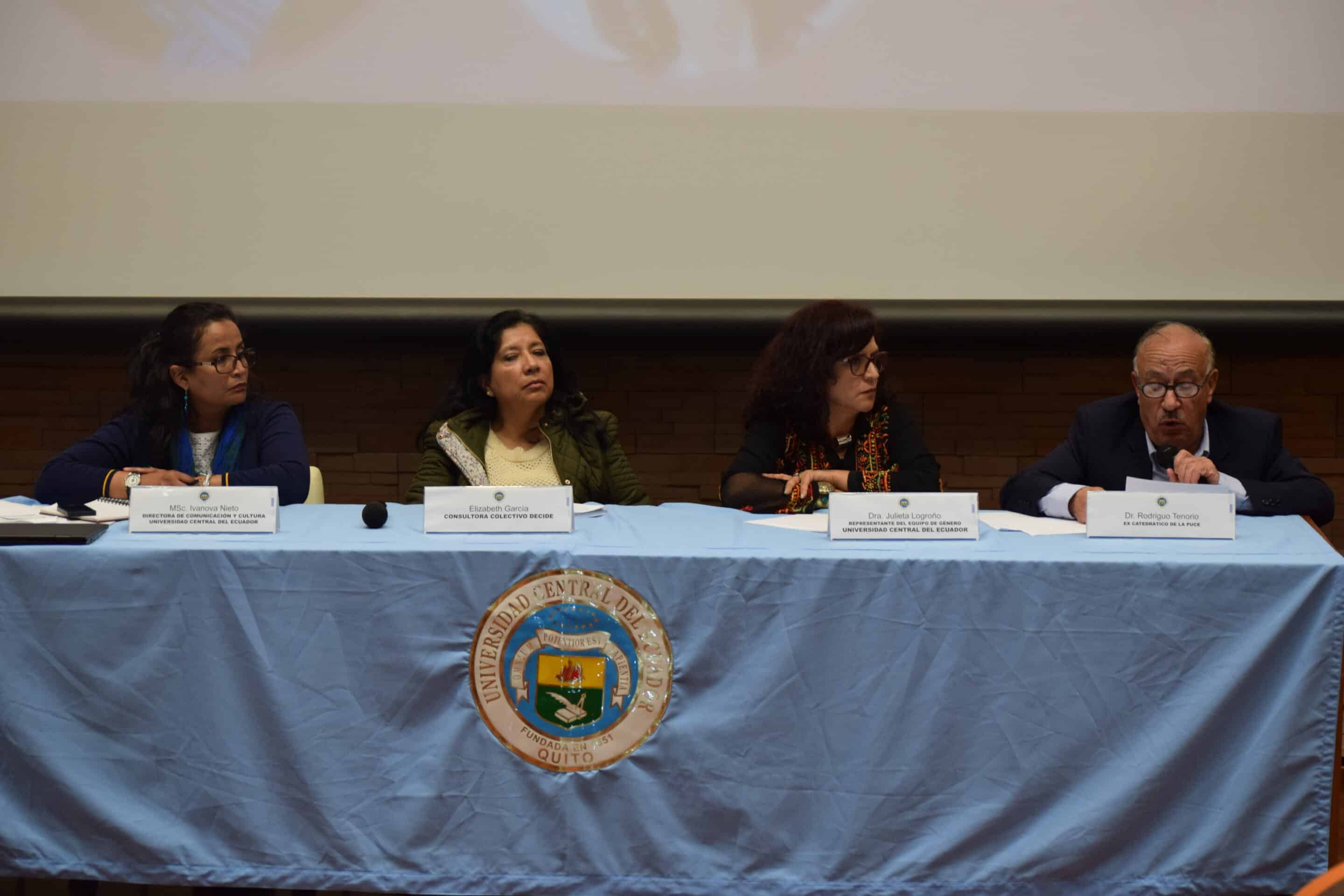 El panel que analizó el estudio estuvo conformado por Julieta Logroño, representante del Equipo de Género de la Universidad Central del Ecuador (UCE), Elizabeth García, consultora de la Corporación de Estudios Decide y el psicólogo clínico Rodrigo Tenorio.