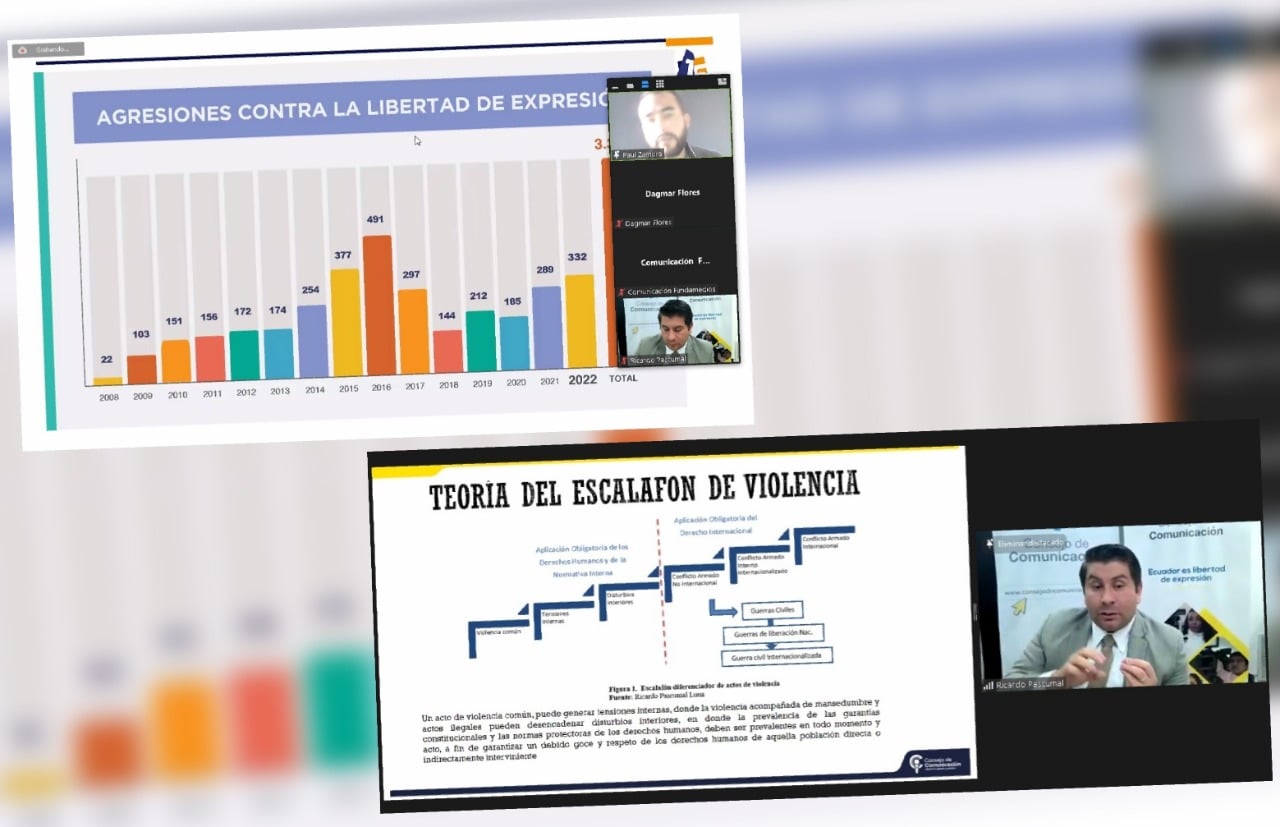 El primer capacitador de este martes fue Paúl Zamora, periodista con 12 años de experiencia. Desde hace dos años trabaja como coordinador de Libertades de Fundamedios y responsable de comunicación de la Red Voces del Sur. Inició exponiendo las cifras de las agresiones contra la prensa en 2022. Este año, hasta octubre, se han registrado 332 agresiones, de las cuales 164 ocurrieron durante el paro nacional de junio.