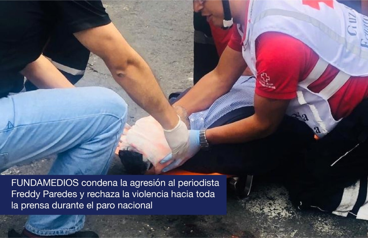 La Fundación Andina para la Observación y Estudio de Medios (FUNDAMEDIOS) rechaza enérgicamente la agresión que sufrió Freddy Paredes, periodista de Teleamazonas, quien fue golpeado brutalmente con una piedra en su cabeza, después de salir del Ágora de la Casa de la Cultura, en donde fue retenido por el movimiento indígena.