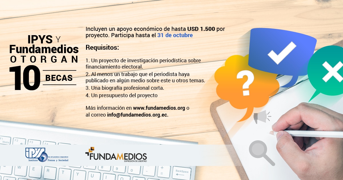 Fundamedios y el Instituto Prensa y Sociedad (IPYS) del Perú convocan a la primera edición del Curso Avanzado de Periodismo de Investigación (CAPI 2016) en Ecuador, un concurso de becas que permitirá a un máximo de 10 periodistas ecuatorianos participar de un programa para el financiamiento, acompañamiento y ejecución de proyectos de investigación de cuatro meses. Los proyectos deben tratar temáticas relacionadas al financiamiento de las campañas electorales.