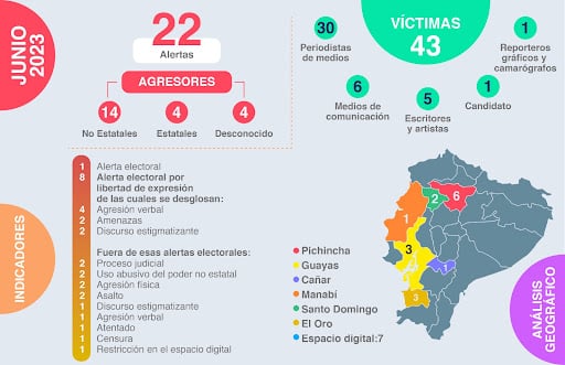 Aunque esta cifra de 53 agresiones suena alentadora, tomando en cuenta que en el primer trimestre del 2023 se registraron 79 agresiones, el panorama no es esperanzador. Las víctimas de amenazas, atentados, discursos estigmatizantes y otras formas de ataques, son muchos más que en el mes pasado. Este mes se reportan 43 víctimas, 20 más que en mayo. Lamentablemente en medio de estas elecciones adelantadas, los ataques, enjuiciamientos y amenazas en contra de periodistas se ha vuelto parte de la campaña de algunos candidatos. En total se han registrado 9 alertas por violencia electoral, de las cuales 8 son por temas de libertad de expresión.