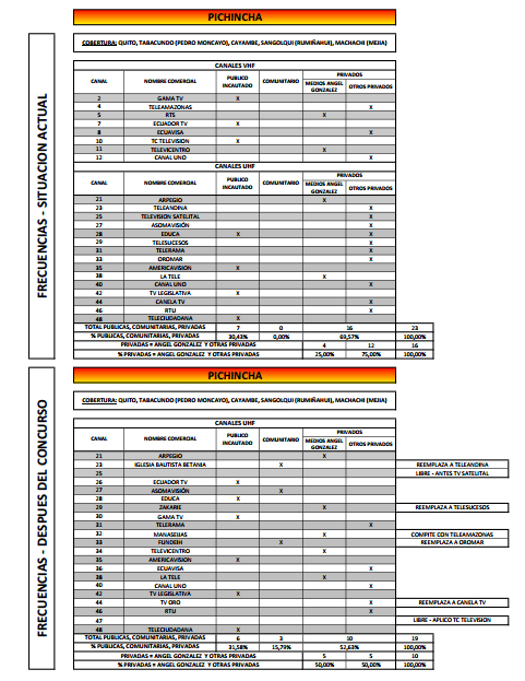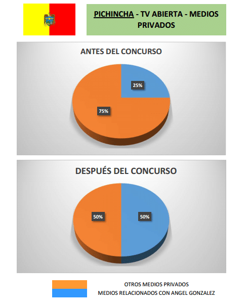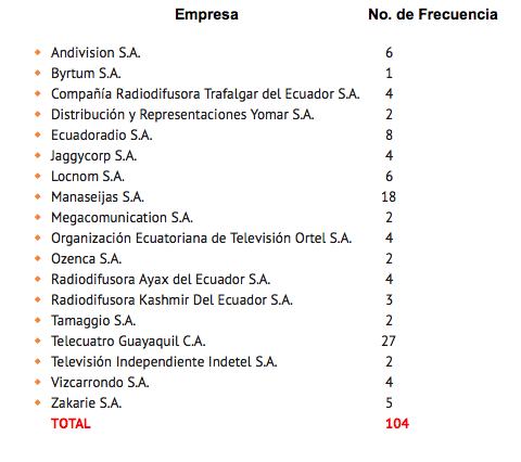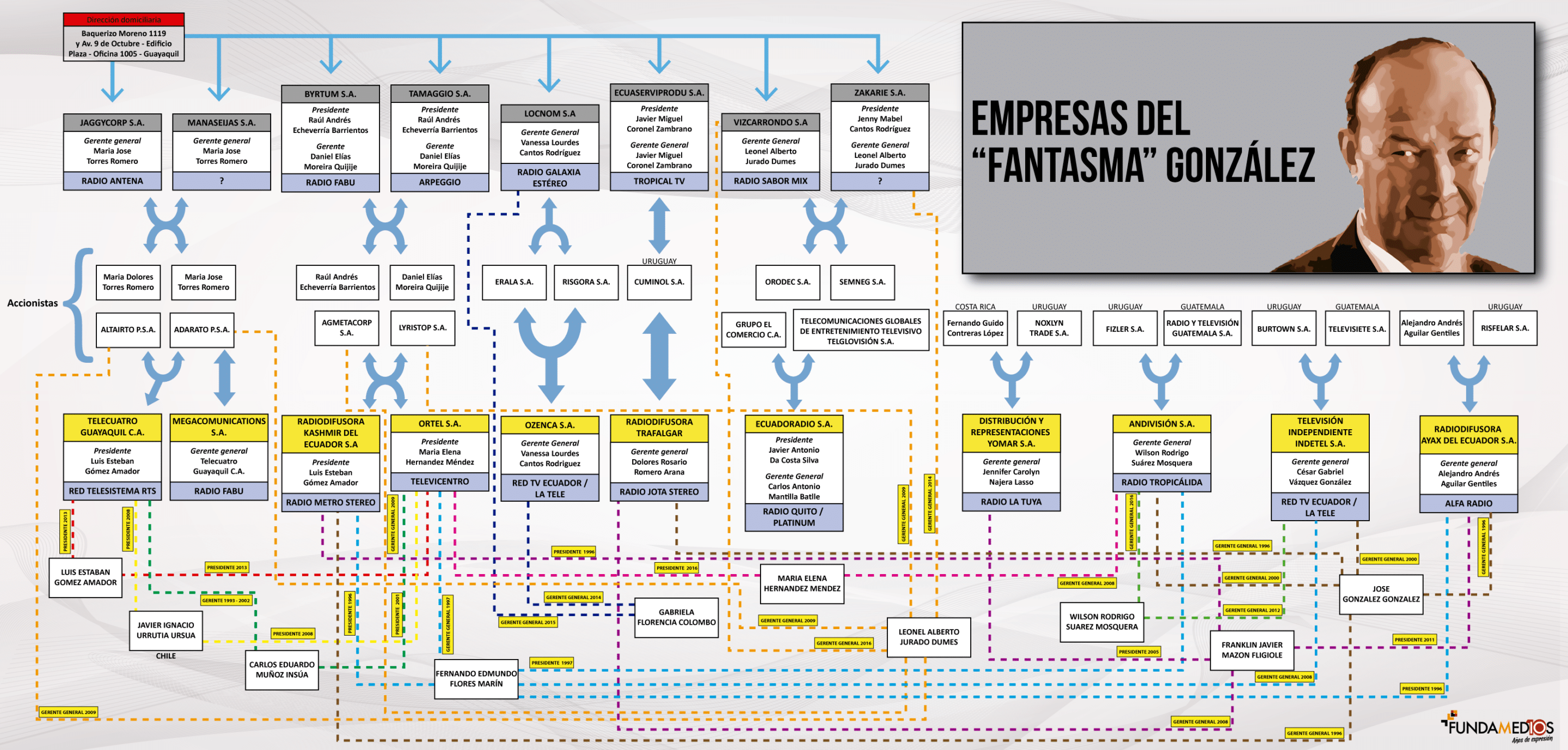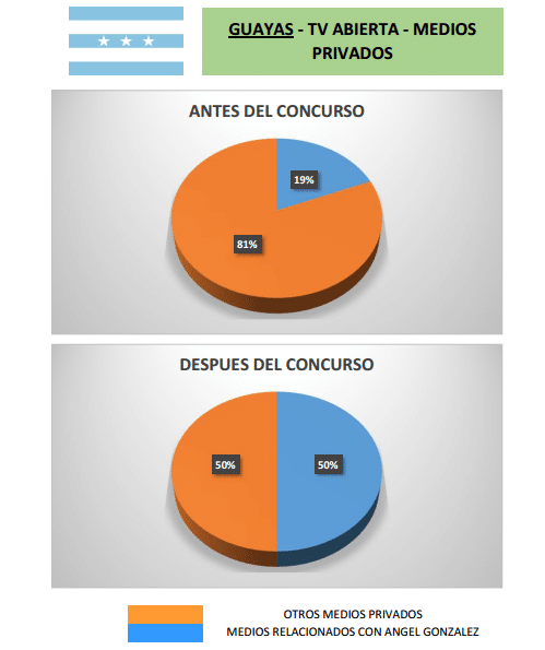 El conglomerado de González en Ecuador postuló en total para 104 frecuencias: 60 de TV, 43 de radio FM y una de radio AM. Como ya reveló Fundamedios en un comunicado anterior, lo hizo a través de empresas 18 empresas, 10 de las cuales ya formaban parte de su oligopolio mediático. Las ocho restantes son empresas relativamente nuevas, que no tenían asignada una frecuencia. Ninguna fue descalificada; todas pasaron a la segunda fase, en el Consejo de Regulación de la Comunicación (Cordicom).