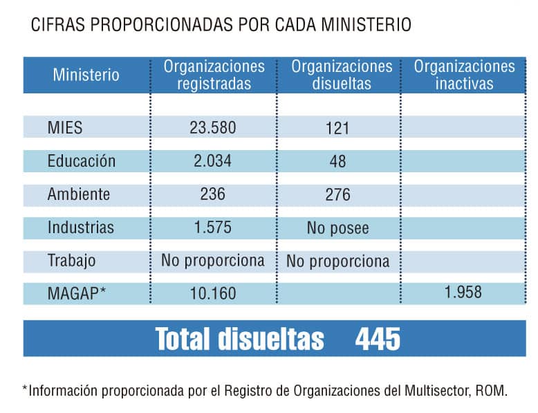 El MAGAP fue uno de los seis ministerios a los que se solicitó información acerca de las organizaciones registradas y disueltas, de los cuales solo tres respondieron con la información completa. El resto o acudió a leguleyadas para no dar la información, o simplemente declaró no tenerla levantada.