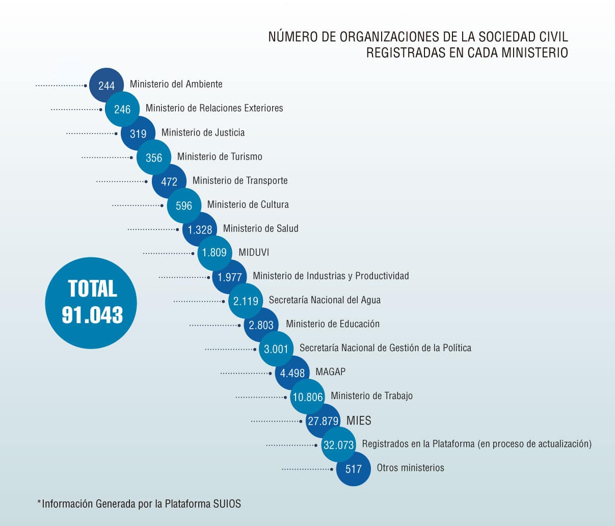 Según la información proporcionada por la Secretaría Nacional de Gestión de la Política, al 27 de abril de 2017, el número de organizaciones de la sociedad civil registradas en el SUIOS es de 91.034. No obstante, la cifra arrojada por la plataforma web en una fecha cercana era de 90.148. Casi mil menos. A fecha actual aún no se equiparan esas cifras… y se supone que la información pertenece a la misma plataforma. Que alguien lo explique.