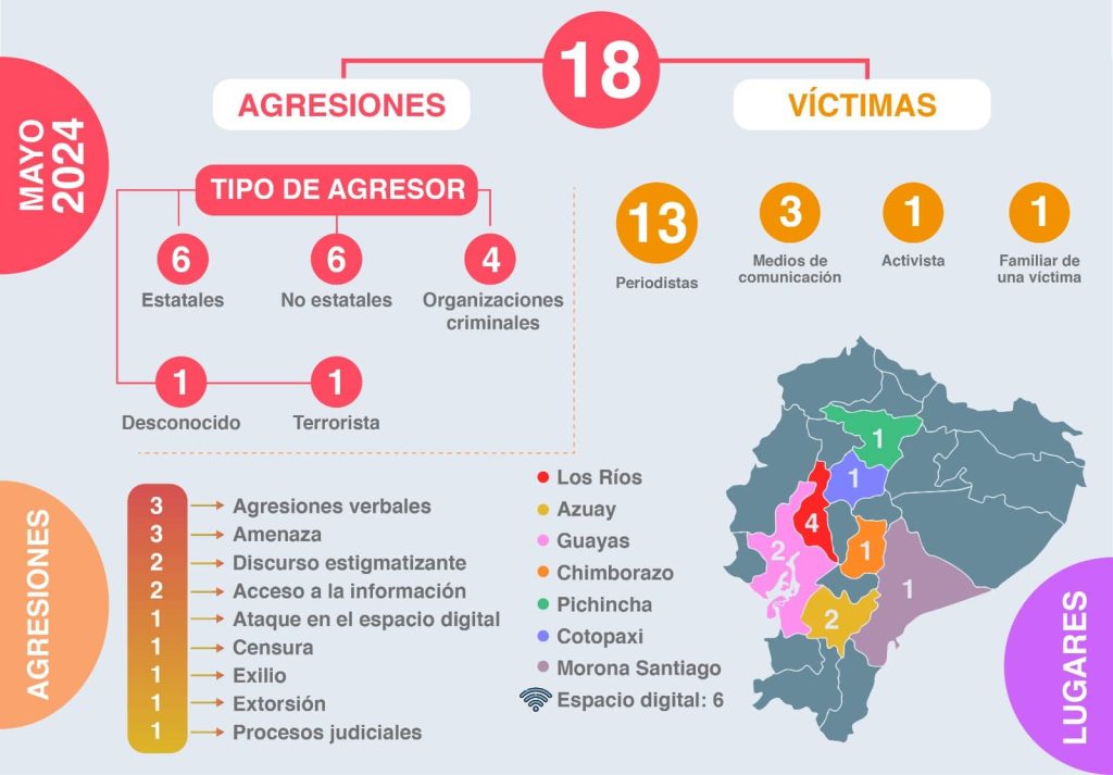 Ecuador, 30 de mayo de 2024.- Desde que inició el año se han registrado cinco periodistas que han tenido que exiliarse. Esto, ante una ineficiencia e incluso negativa estatal. En mayo de 2024, Fundamedios registra 18 agresiones contra la libertad de expresión y prensa en Ecuador. En lo que va del año suman 98 agresiones.