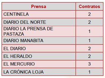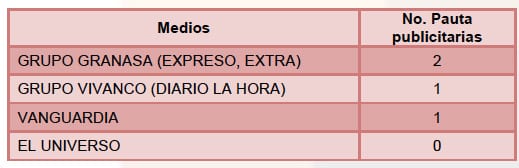 De la información entregada por las instituciones, el estudio arroja que los medios con menor pauta estatal son el Grupo Granasa (Expreso, Extra) con dos contratos; Grupo diario La Hora y revista Vanguardia, con uno, mientras que diario El Universo no tiene ningún contrato. Todos estos medios han sido descalificados por el presidente Rafael Correa en diversas intervenciones públicas por su línea crítica al régimen. Asimismo, en necesario señalar que El Universo afrontó una demanda por injurias interpuesta por el Presidente de la República, quien pidió una indemnización de 80 millones de dólares.