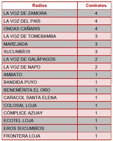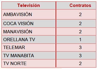 A estos medios le siguen los del Grupo Ecuavisa-Vistazo y Grupo El Comercio con 12 contratos publicitarios, mientras que el Grupo Sonorama- Canal Uno tiene 11; el canal de TV RTS, cinco contratos y Teleamazonas, cuatro.
