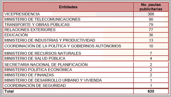 Los medios que reciben mayor pauta publicitaria, con 41 órdenes entregadas, son los medios en manos del Estado. El Telégrafo tiene siete órdenes; Ecuador TV y Cablevisión, seis; Gama TV, TC y Radio Pública, cinco; PP El Verdadero, cuatro, mientras que Editogran S. A. tiene dos y Radio Universal, una.