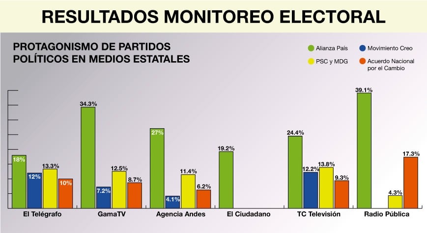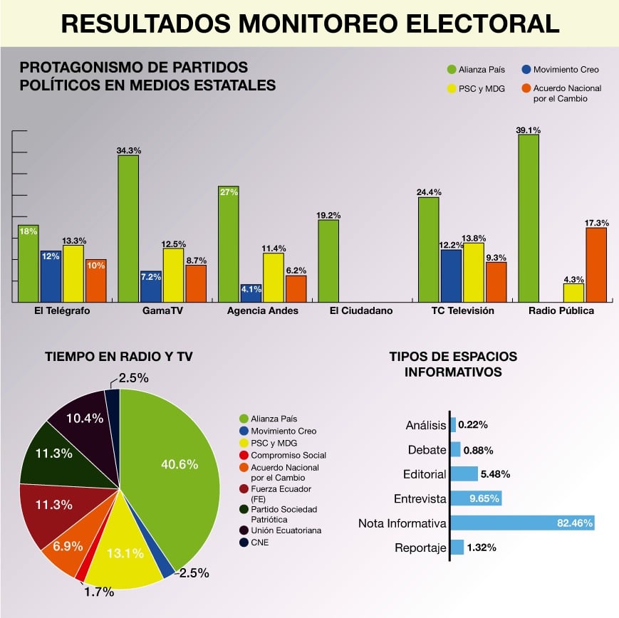 El observatorio de Medios del Ecuador (OME), un proyecto de Fundamedios, monitoreó, durante enero de 2017, seis medios de comunicación en manos del Estado, de los cuales contabilizó 199 espacios informativos que favorecían al candidato oficialista Lenin Moreno, de una muestra de 456. Entre los medios que se analizaron en este estudio se encuentran: dos canales de televisión (Gama Tv y Tc Televisión), dos medios digitales (Agencia Andes y El Ciudadano), el diario El Telégrafo y Radio Pública.