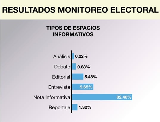 De acuerdo a los géneros periodísticos, en los 456 espacios informativos se encontraron: 376 noticias, 44 entrevistas, 25 editoriales, 6 reportajes, 4 debates y 1 análisis sobre coyuntura política electoral.