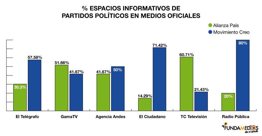 El análisis determinó que tanto el candidato de Alianza País Lenín Moreno, como su contrincante de la oposición obtuvieron el mismo espacio en estos medios de comunicación al alcanzar el 45% de la muestra. Sin embargo, se evidencia una estrategia para mostrar equidad en el tratamiento periodístico favoreciendo de todas formas a su candidato al establecer un discurso en contra de Guillermo Lasso.