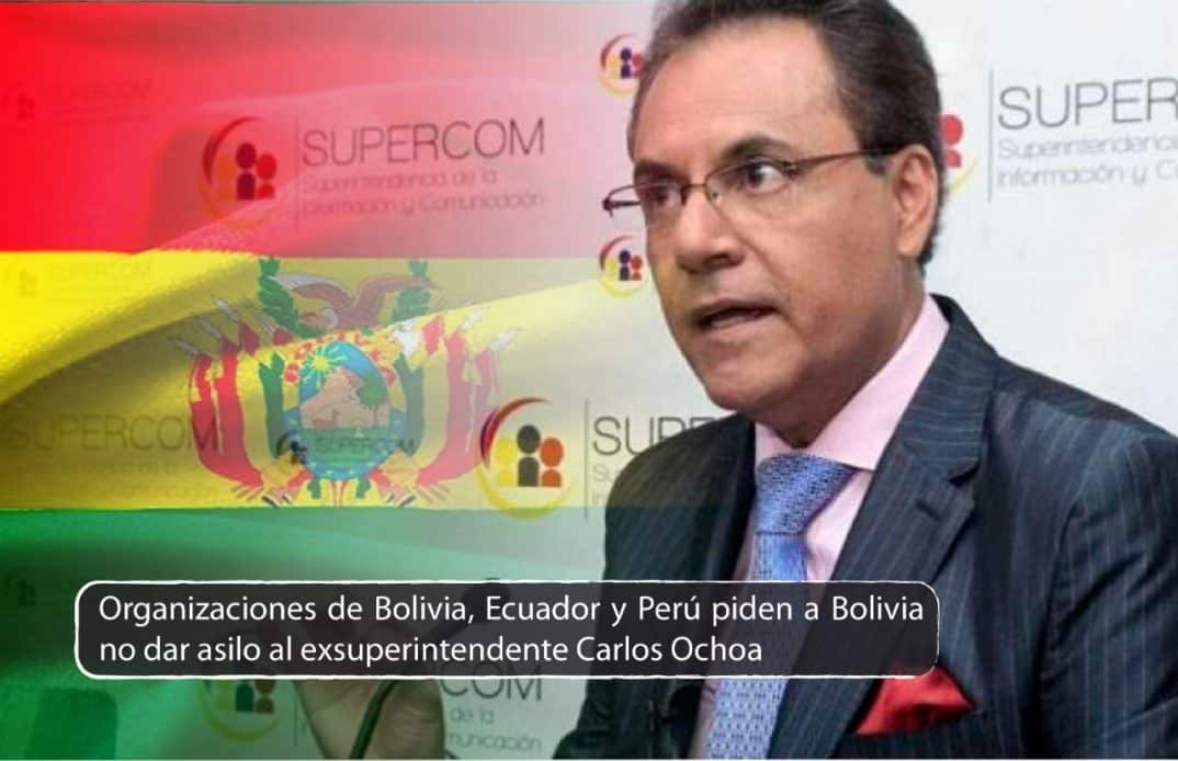 Organizaciones de Bolivia, Ecuador y Perú reclamaron hoy al Gobierno boliviano que no conceda asilo al exsuperintendente de Comunicación ecuatoriano Carlos Ochoa y lo devuelva de su país para que sea juzgado.