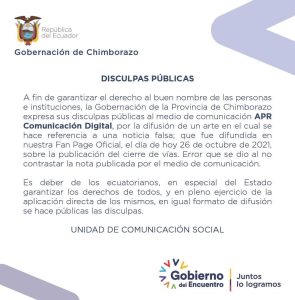 La Mesa Técnica Provincial para Protección de Periodistas y Comunicadores de Chimborazo envió una carta a la gobernadora de esa provincia, María José Pontón, través de la cual rechazaron la falta de comunicación por parte de la institución ya que sin contrastar la información y por medio de un post que se publicó se desprestigia el trabajo periodístico del medio de comunicación digital para informar a la ciudadanía sobre el cierre de algunas vías. Horas después, a través de un comunicado, la Gobernación de Chimborazo solicitó al medio de comunicación digital disculpas públicas.